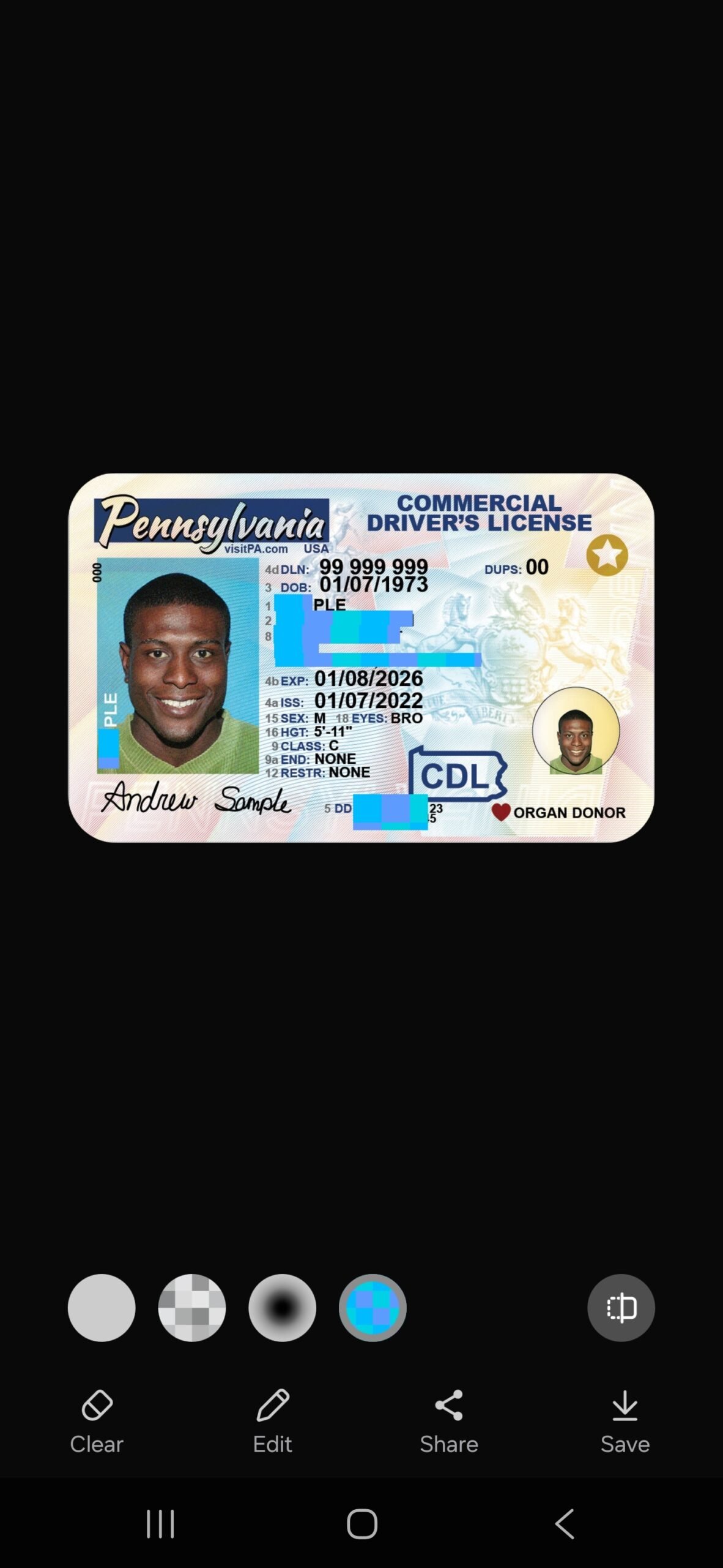 I dette eksempel deler brugeren et billede, der indeholder et kørekort. Denne person kan vælge at skjule den information, de ikke ønsker, at den anden person skal se. Og det ser ud til, at du har flere måder at skjule den information på, uanset om du vil pixelere den, sløre den eller redigere den. Du vil endda være i stand til at sammenligne de redigerede og uredigerede versioner, før du sender billedet afsted.
