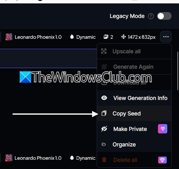 Når billederne er genereret, skal du klikke på de tre prikker ved siden af de genererede billeder og vælgeKopier frø.