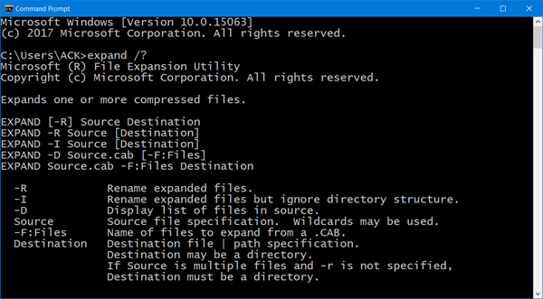 For at se kommandolinjeindstillingen tilgængelig for expand.exe skal du åbne et kommandopromptvindue, skrive følgende og trykke på Enter:
