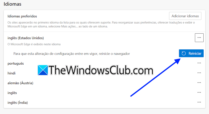 Efter at have udført ovenstående trin, vil du se enblå knapi Edge. Dette erGenstartknap. Klik på den. Edge genstarter og viser sproget på engelsk.