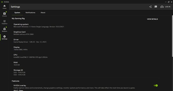 Den sidste fane er fanen Indstillinger, som giver dig adgang til specifikationerne for din gaming-pc (operativsystem, grafikkort, driver, skærm, CPU, RAM, lager osv.), appfunktioner, biblioteksscanning, notifikationer og meget mere. Fanen indeholder også en genvej til det gamle NVIDIA Kontrolpanel, som sandsynligvis kun vil vare indtil applikationen er officielt frigivet.