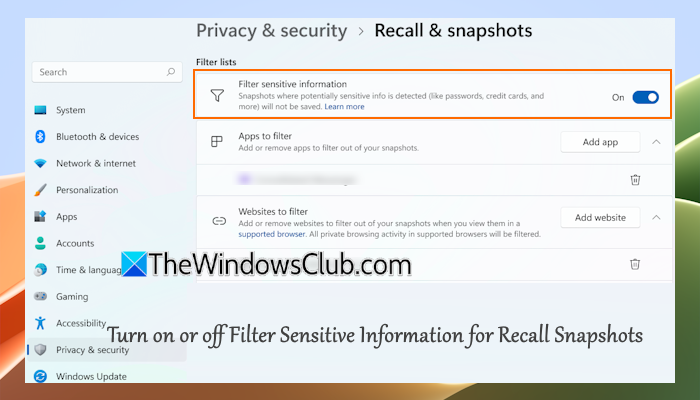 I denne tutorial vil vi vise dighvordan man slår filterfølsomme oplysninger til eller fraforGenkald Snapshotspå enWindows 11PC. Når du bruger Recall på enCopilot+ pci Windows 11 tager Windows med jævne mellemrum snapshots af computerskærmen og gemmer dem på din pc. Men når Recall registrerer potentielt følsomme oplysninger som kreditkortnummer, generel adgangskode, kørekortnummer, bankkontonummer osv., gemmer den ikke øjebliksbilleder. Det sker pgaFilterindstilling for følsom informationsom forbliver aktiveret som standard for at sikre datafortrolighed. Men du kan ændre denne indstilling med et par enkle trin.