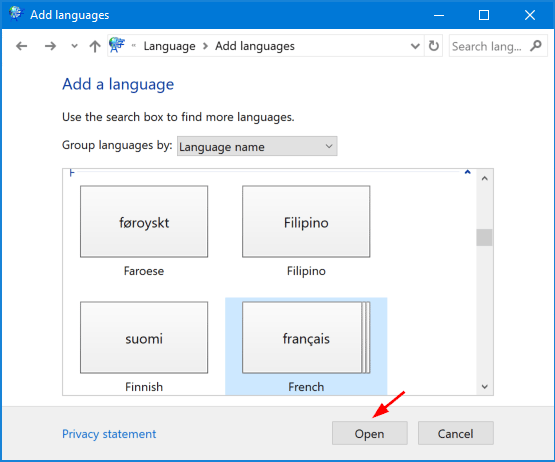 - Wählen Sie eine Sprache aus, die Sie installieren möchten, und klicken Sie aufOffen.