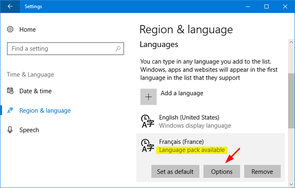 - Wenn Sie den gesamten Systemtext in der neuen Sprache anzeigen möchten, kehren Sie zur Registerkarte Region & Sprache zurück. Wählen Sie die neu hinzugefügte Sprache aus und klicken Sie aufOptionenTaste.