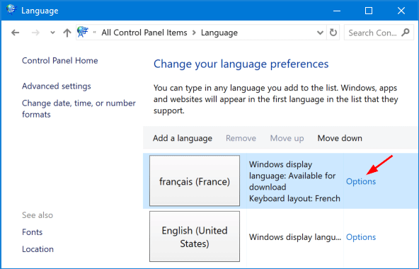 - Die von Ihnen ausgewählte Sprache wird nun zur Liste der Eingabesprachen für Ihre Tastatur hinzugefügt. Wenn Sie die neue Sprache zur Anzeige der Benutzeroberfläche von Windows 10 verwenden möchten, klicken Sie aufOptionenLink.