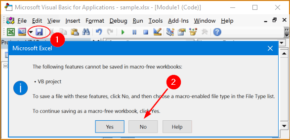 - KlickenSpeichernund schon bist du fertig. Wenn Sie eine makrofreie Arbeitsmappe verwenden, erhalten Sie die Warnmeldung „Die folgenden Funktionen können nicht in einer makrofreien Arbeitsmappe gespeichert werden“. KlickenNEIN.