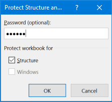 - Das Dialogfeld „Struktur und Fenster schützen“ wird geöffnet. Stellen Sie sicher, dass dieStrukturOption ist aktiviert. Geben Sie Ihr Passwort ein und klicken SieOK.