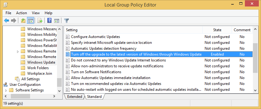 Computer Configuration -> Administrative Templates -> Windows Components -> Windows Update - Doppelklicken Sie auf „Deaktivieren Sie das Upgrade auf die neueste Windows-Version über Windows Update”Richtlinie im rechten Bereich, AuswählenErmöglichtund dann klickenOK.