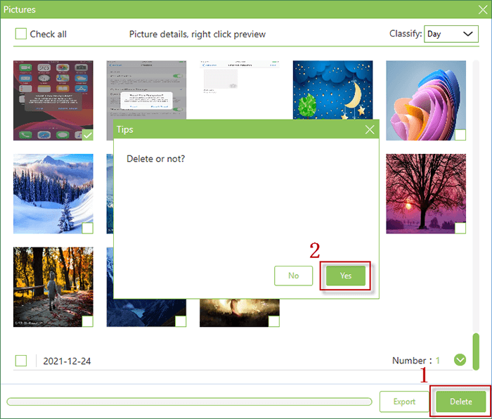 (Hinweis: Um ein versehentliches Löschen von Fotos zu vermeiden,doppelklickenKlicken Sie auf das Foto, um eine Vorschau anzuzeigen. Darüber hinaus können Sie auch die Fotos auswählen und anklickenExportin der unteren rechten Ecke, um sie auf dem PC zu sichern.)