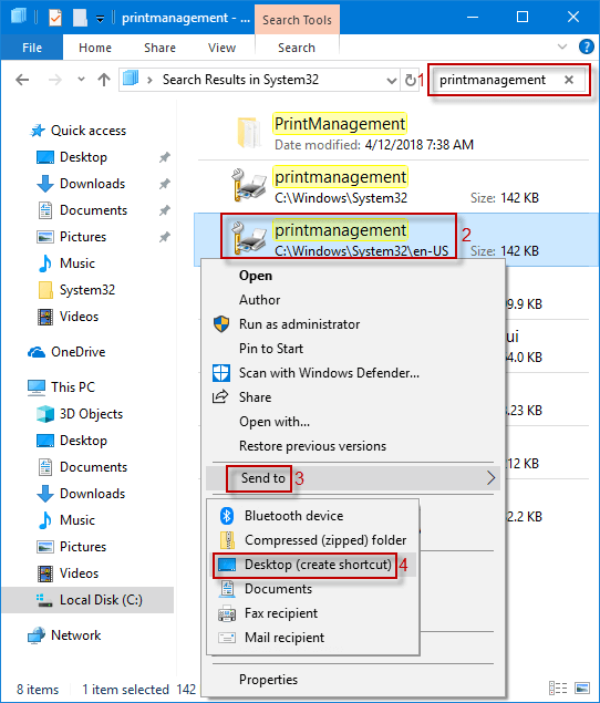 Schritt 2: Gehen Sie im Datei-Explorer-Fenster zuDieser PC>Lokale Festplatte (C:)>Windows>System32Ordner. Geben Sie im System32-Verzeichnis Folgendes ein:Druckmanagementin der oberen rechten Ecke oder scrollen Sie nach untenDruckmanagementWählen Sie die Anwendung aus und klicken Sie mit der rechten Maustaste darauf, um sie auszuwählenSenden an>Desktop (Verknüpfung erstellen)aus dem Kontextmenü.