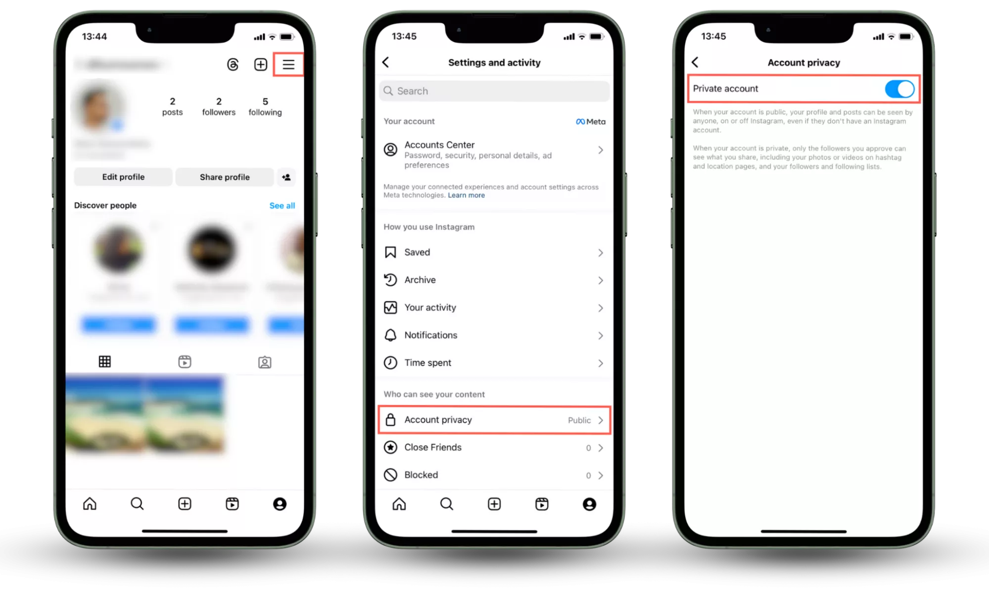Schritte 1–3: Tippen Sie auf die drei übereinander angeordneten Linien auf Ihrer Instagram-Profilseite, wählen Sie „Kontodatenschutz“ und aktivieren Sie „Privates Konto“.Notiz