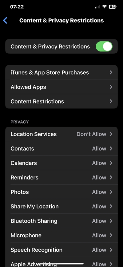 Schritt 2:Wählen Sie „Inhalts- und Datenschutzbeschränkungen“.