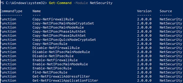Sie können die verfügbaren Cmdlets im NetSecurity-Modul auflisten, indem Sie den folgenden Befehl verwenden:
