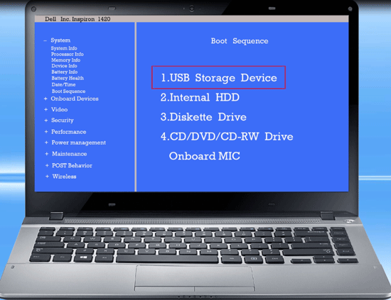 Stecken Sie nun die Windows Password Refixer-Diskette in einen USB-Anschluss oder ein CD-ROM-Laufwerk Ihres Dell-Laptops. Starten/neustarten Sie den Laptop. Sobald das erste Herstellerlogo angezeigt wird, halten Sie sofort die Setup-Taste (F2) oder die Startoptionstaste (F12) gedrückt, um die BIOS-Setup-Schnittstelle oder das Startmenü aufzurufen, und legen Sie dann diese Festplatte (USB-Gerät oder CD/DVD-Flash-Laufwerk) als erstes Startgerät fest, damit Ihr Dell-Laptop von dieser Festplatte startet.