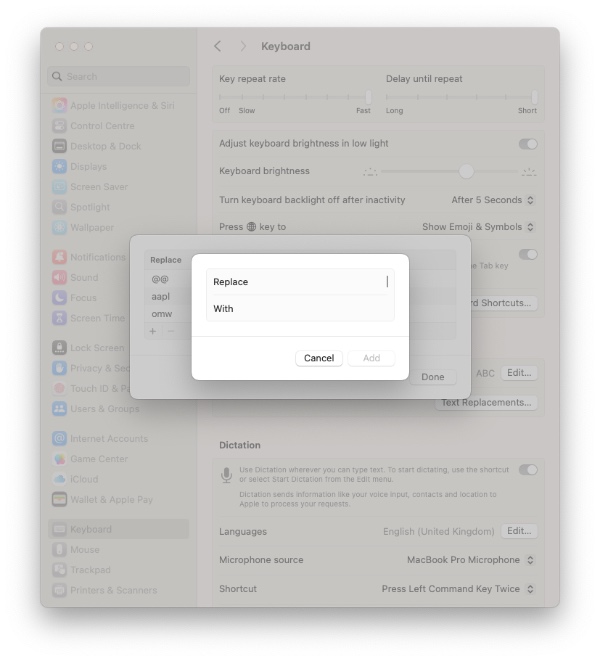 Fügen Sie unter macOS eine Textersetzungsverknüpfung hinzu