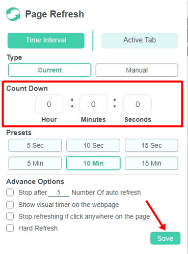 6. Stellen Sie die einZeitintervallfür die Seitenaktualisierung und klicken Sie aufSpeichern.