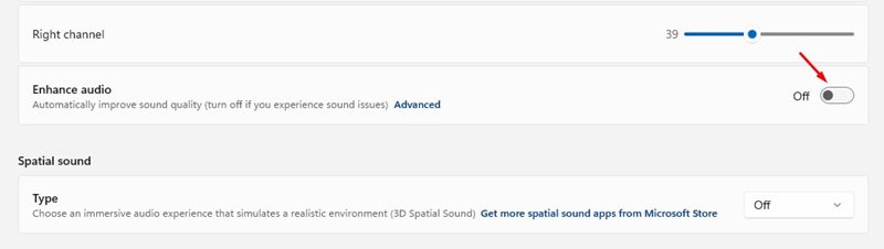 Die mit Windows 11 eingeführte Audioverbesserungsfunktion mag für viele eine Spielerei sein, aber in meinem Fall hat sie funktioniert. Bitte beachten Sie, dass die Aktivierung der Audioverbesserung auf einigen PCs die Situation noch verschlimmern kann. Versuchen Sie daher am besten, sie zu aktivieren/deaktivieren.