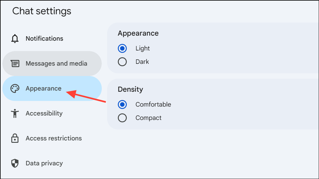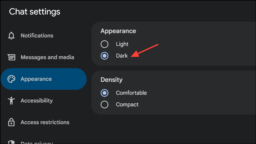 Schritt 3:Wählen Sie unter dem Abschnitt "Erscheinungs" "dunkel". Alle kompatiblen Apps, einschließlich Google Chat, verwenden nun den Dark -Modus.