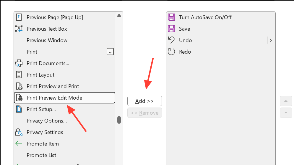 Schritt 4:Scrollen Sie durch die Liste und lokalisierenPrint Preview Edit Mode. Wählen Sie es aus, klicken Sie auf dieAddSchaltfläche, um es in die Liste der Befehle zu verschieben, die in Ihrer Schnellzugriffs -Symbolleiste angezeigt werden.