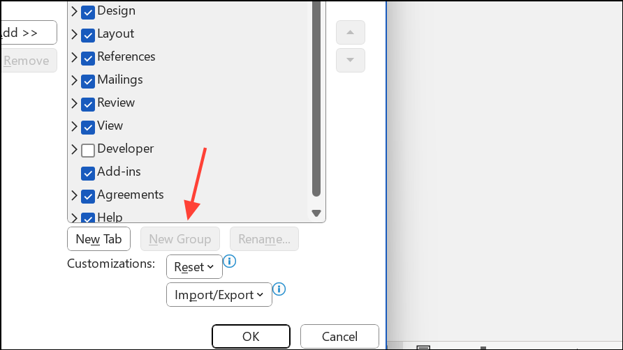 Schritt 3:Erstellen Sie vor dem Hinzufügen des Befehls eine neue Gruppe auf der Registerkarte "Vorgespanntemben", indem Sie die Registerkarte auswählen. Klicken Sie auf die Registerkarte "New Group, und benennen es, falls gewünscht.