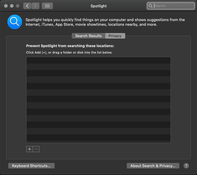 Beachten Sie, dass Sie in den Einstellungen nur den Ordner und nicht die bestimmte Datei ausschließen können. Wenn Sie den Ordner wieder zu Ihren Spotlight-Suchen hinzufügen möchten, kehren Sie unter Spotlight zur Registerkarte „Datenschutz“ zurück. Markieren Sie den Ordner und klicken Sie auf die Schaltfläche mit dem Minuszeichen, um ihn zu entfernen. Wenn Sie eine einzelne Datei ausschließen müssen, können Sie sie in einem Ordner ablegen und sie dann zur macOS Spotlight-Ausschlussliste hinzufügen.