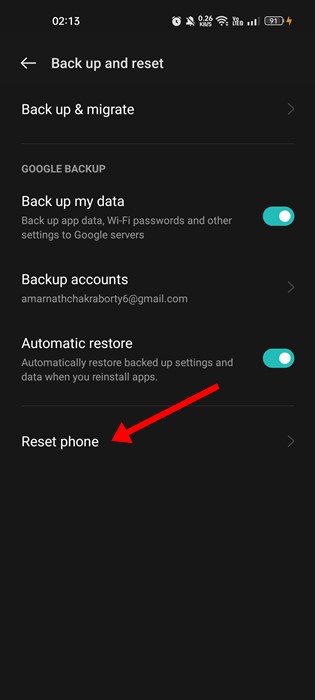 3. Tippen Sie im Bildschirm „Sichern und Zurücksetzen“ aufTelefon zurücksetzenOption.