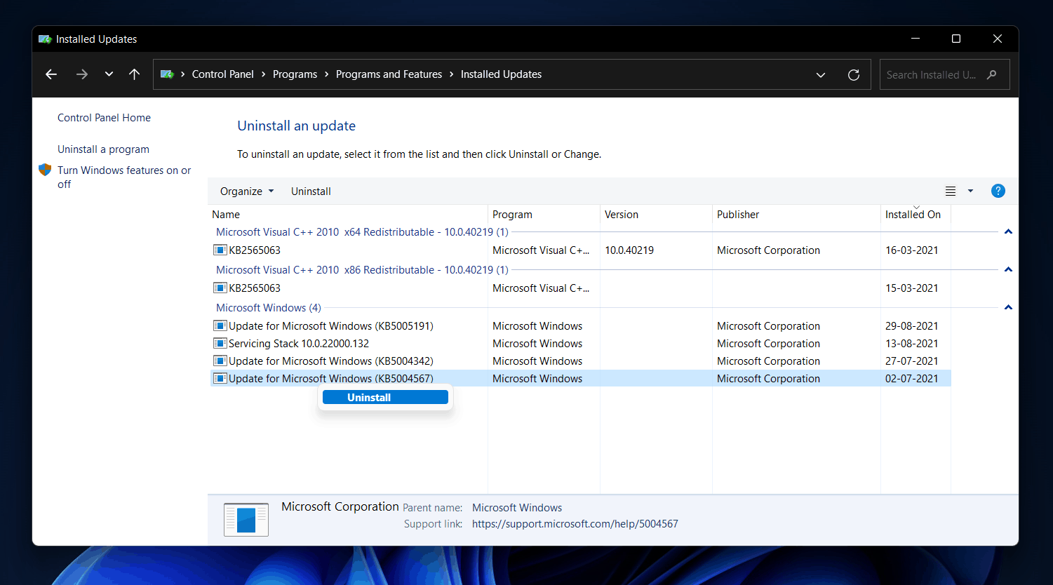- Klicken Sie hier aufInstallierte Updates anzeigenin der linken Seitenleiste.