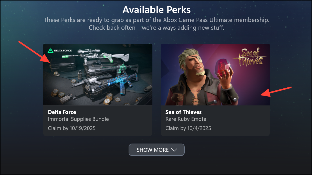 Game Pass Ultimate Mitglieder erhalten Zugang zu exklusiven Vergünstigungen-freie In-Game-Add-Ons, Verbrauchsmaterialien und Partnerangebote. Diese Vergünstigungen drehen sich monatlich und können Artikel wie Charakter Skins, Währungsbündel oder ein zeitlich begrenzter Zugriff auf Premium-Inhalte in beliebten Titeln wie z. B. umfassenSea of ThievesAnwesendWWE 2K25, oderThe First Descendant.