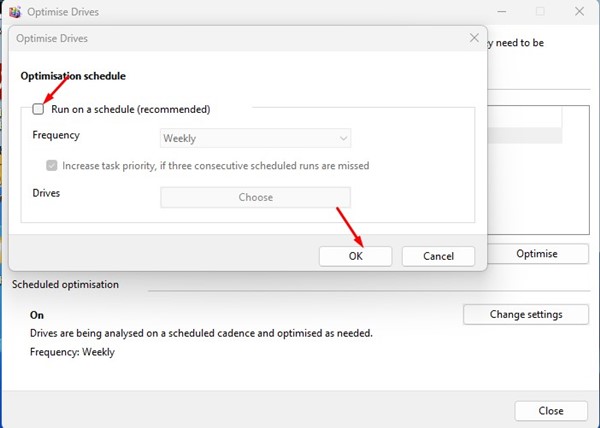3.Deaktivieren Sie das KontrollkästchenDieNach einem Zeitplan ausführenOption. Sobald Sie fertig sindKlicken Sie hierOK.