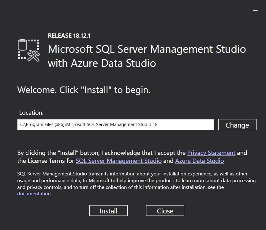 Notiz: Die letzte stabile Version vonSQLServer Management Studio (SSMS)18, was SSMS entspricht2019, IstSSMS 18.12.1. Diese Version wurde am veröffentlicht21. Juni 2022, mit der Build-Nummer15.0.18424.0.