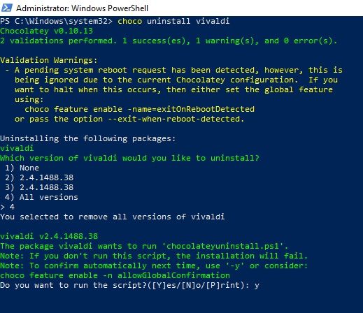 Vivaldi wird nicht von Ihrem System deinstalliert. Je nachdem, welches Programm Sie deinstallieren, werden Sie möglicherweise um eine GUI-basierte Bestätigung zur Deinstallation des Programms gebeten. Sie können sogar zusätzliche Argumente verwenden, um die Deinstallation von Programmen zu erzwingen, was auch auf Chocolatey möglich ist.