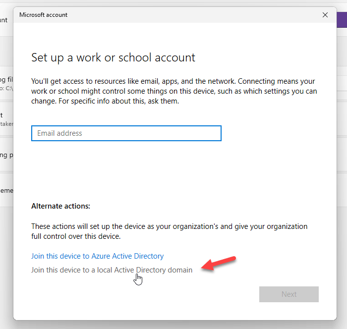 Wenn Sie versuchen, ein Geschäfts- oder Schulkonto hinzuzufügen, bietet es die Möglichkeit, das Gerät direkt einer lokalen Active Directory-Domäne hinzuzufügen oder einer solchen beizutreten. Mit dieser Option können Sie Ihr Problem lösen. Befolgen Sie dazu diese Schritte: