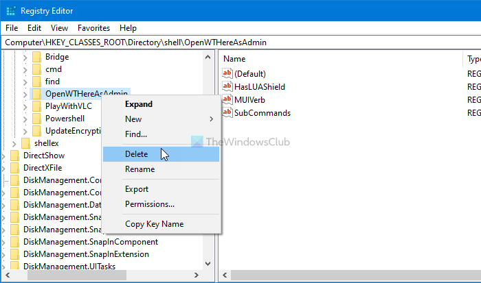 Klicken Sie mit der rechten Maustaste aufOpenWTHereAsAdmin> Wählen Sie die ausLöschenOption und bestätigen Sie die Änderung.
