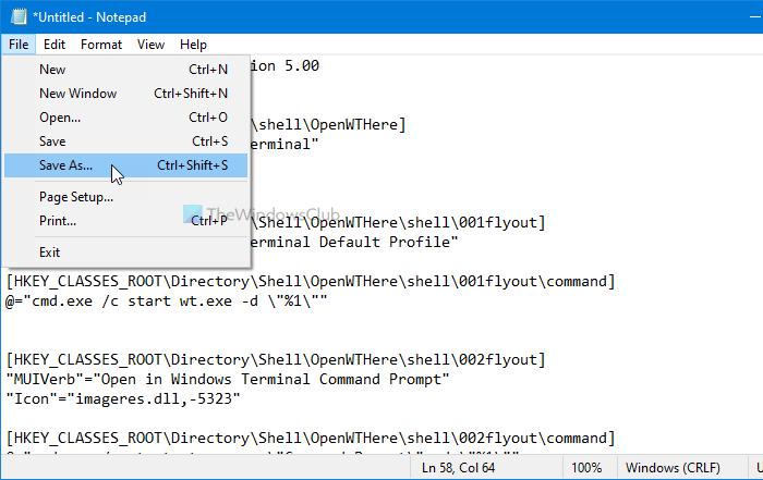 Geben Sie einen Namen mit ein.regErweiterung (z. B. TermExpMenu.reg) auswählenAlle Dateienaus demAls Typ speichernDropdown-Liste und klicken Sie aufSpeichernTaste.