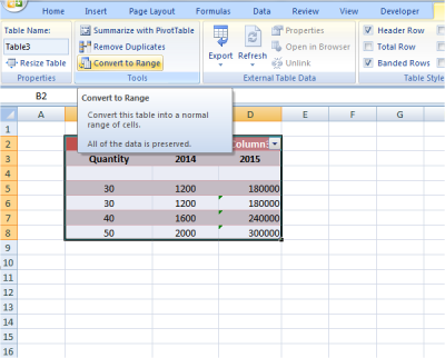 Es wird gefragt: „Möchten Sie die Tabelle in einen normalen Bereich konvertieren?“ und klicken Sie auf „Ja“. Sie werden sehen, dass Filter entfernt werden und das Tabellenformat auf die Daten angewendet wird.