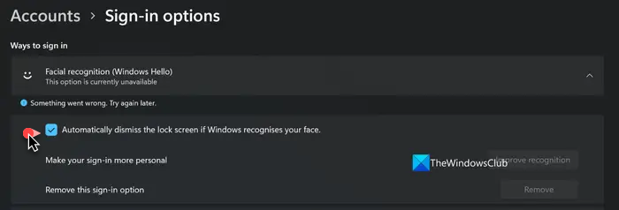 Es wird ein Schalter angezeigt, der besagt:Den Sperrbildschirm automatisch schließen, wenn Windows Ihr Gesicht erkennt.