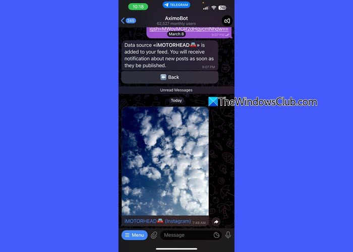 Bedenken Sie außerdem, dass Benachrichtigungen möglicherweise nicht sofort erfolgen und es einige Zeit dauern kann, bis Aktualisierungen angezeigt werden. Als ich AximoBot ein Instagram-Konto hinzufügte, bemerkte ich, dass die Antwort verzögert war. Obwohl der Bot das Konto erfolgreich verfolgte, dauerte es etwa 24 Stunden, bis die Updates angezeigt wurden. Diese Verzögerung kann auf die Aktualisierungsintervalle des Bots oder die Art und Weise zurückzuführen sein, wie er Daten abruft.