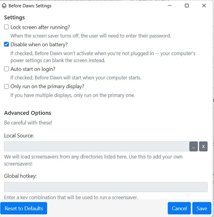 - Um Ihren eigenen Bildschirmschoner mit Before Dawn zu erstellen, müssen Sie ein lokales Verzeichnis Ihrer Codes festlegen.