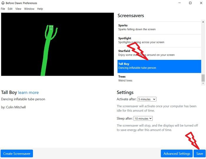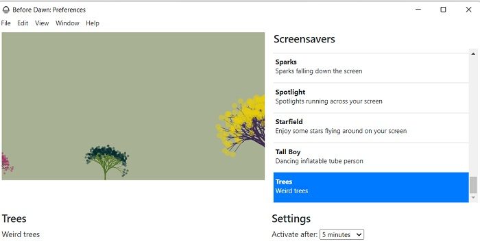 Before Dawn ist eine Open-Source-Anwendung, die eine Reihe niedlicher und interessanter Bildschirmschoner für Ihren Windows 11/10-PC bietet und Ihnen auch die Erstellung eigener Bildschirmschoner mithilfe webbasierter Technologien ermöglicht. Sie können Javascript, HTML/CSS oder Canvas verwenden, um Ihren eigenen Bildschirmschoner zu erstellen. Es handelt sich um eine plattformübergreifende Anwendung, die für die Arbeit auf mehreren Computerplattformen konzipiert ist.