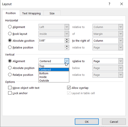 Klicken Sie dann unter „Vertikale Ausrichtung“ auf den Abwärtspfeil und wählen Sie „Innen“, „Außen“, „Mitte“, „Unten“ oder die gewünschte Ausrichtung aus.