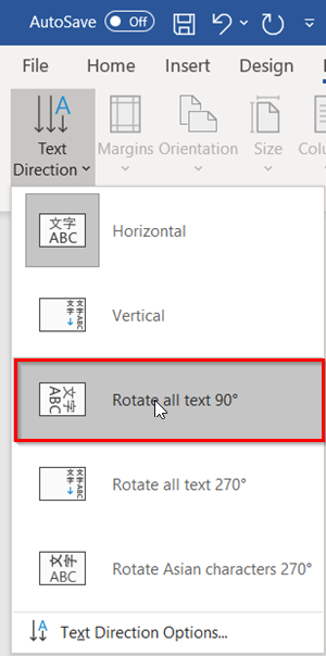 Unter 'Seiteneinrichtung' Abschnitt, gehen Sie zu 'Textrichtung'. Drücken Sie den Abwärtspfeil und wählen Sie „Drehen Sie den gesamten Text um 90' unter 'Textrichtungsoptionen'.