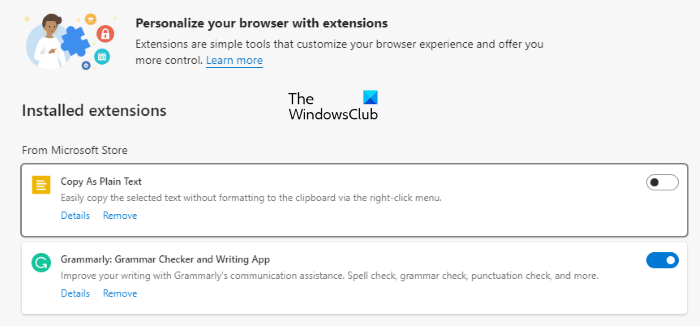 In Edge installierte Erweiterungen könnten für dieses Problem verantwortlich sein. Um dies zu überprüfen, deaktivieren Sie alle Erweiterungen und laden Sie Copilot neu. Sehen Sie, ob es dieses Mal funktioniert. Wenn das Problem dadurch behoben wird, sollte Ihr nächster Schritt darin bestehen, die problematische Erweiterung zu identifizieren. Aktivieren Sie Erweiterungen nacheinander und laden Sie Copilot jedes Mal neu, wenn Sie eine Erweiterung aktivieren. Dies wird Ihnen helfen, den Täter zu identifizieren. Sobald Sie es gefunden haben, deinstallieren Sie es.