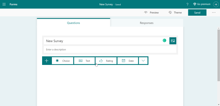 Wenn Sie diese Option auswählen, wird eine neue Seite mit zwei Registerkarten geöffnet:FragenUndAntworten. Bleiben Sie dranFragenTab. Hier beginnen Sie mit der Erstellung der Umfrage. Sie verwenden die Registerkarte „Antworten“, wenn Sie die Einsendungen für Ihre Umfrage überprüfen.