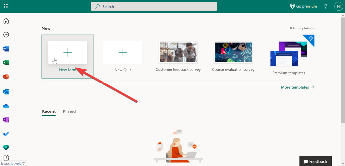 Um die Umfrage von Grund auf zu erstellen, klicken Sie auf die Kachel oder Schaltfläche, um eine zu erstellenNeues Formular. Alternativ können Sie die mit Office Forms gelieferten Vorlagen nutzen, indem Sie auf klickenWeitere VorlagenLink.