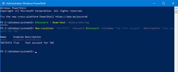New-LocalUser "TWCTEST2" -Password $Password -FullName "TWC Test Account" -Description "Small description”