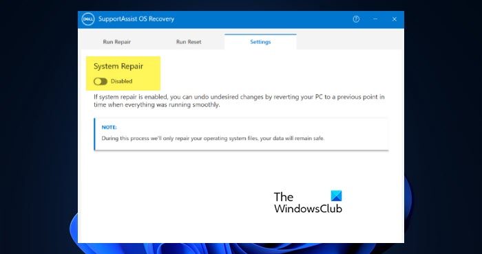 - Deaktivieren Sie die Option „Systemreparatur“ im Dell Support Assist