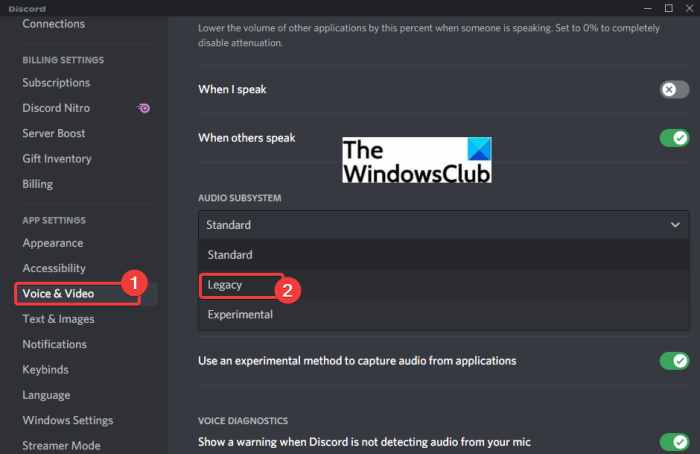 Falls die Discord-App zufällig neu startet, wenn Sie einem Sprachkanal beitreten, liegt möglicherweise ein Problem bei der Audioverarbeitung vor, das das Problem verursacht. Bei Verwendung des Standard- oder Standard-Audio-Subsystems können Probleme mit Discord auftreten, insbesondere bei veralteten Audiotreibern. Überprüfen Sie also das Audio-Subsystem von Discord auf den Legacy-Modus und sehen Sie, ob es hilft. So geht's: