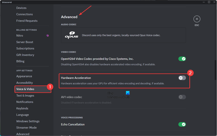 - Deaktivieren Sie die Hardwarebeschleunigung auf Discord.