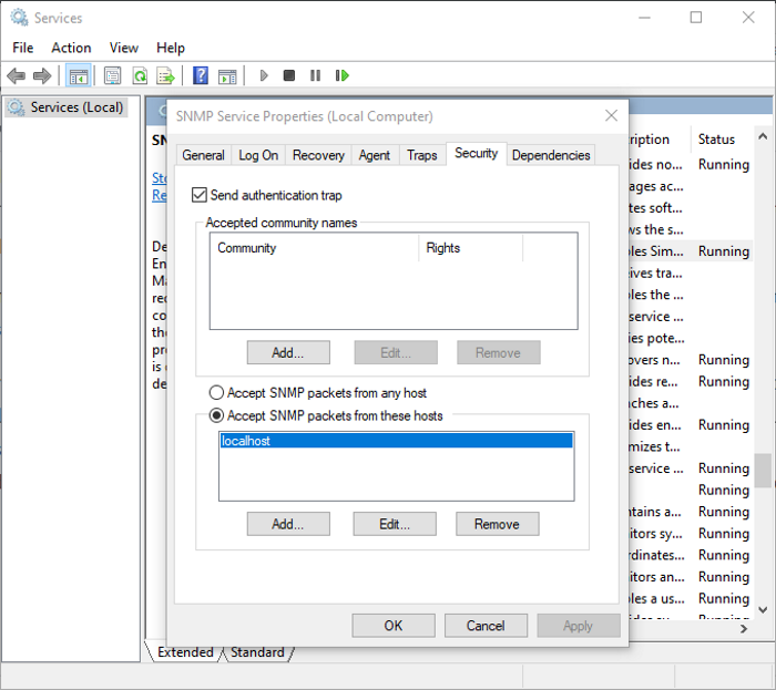 Nach der Installation müssen Sie den SNMP-Dienst in Windows 10 konfigurieren. Es gibt zwei Haupt-SNMP-Dienste, darunter: