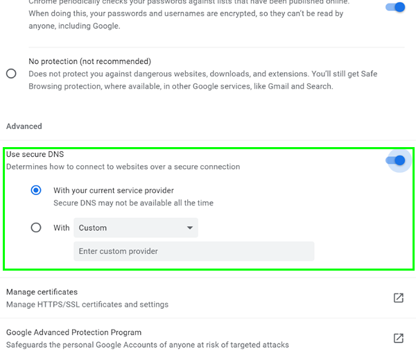 - Aktivieren Sie unten das Kontrollkästchen neben „Aktivieren Sie DNS über HTTPS.“